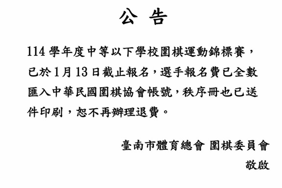 114學年度中等以下學校圍棋運動錦標賽